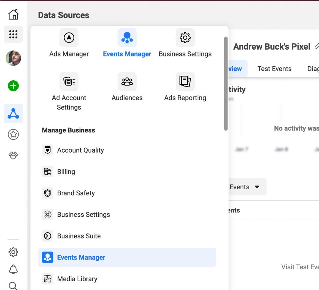 Find your Pixel ID in Facebook Ads Manager, by clicking to the Events Manager page.