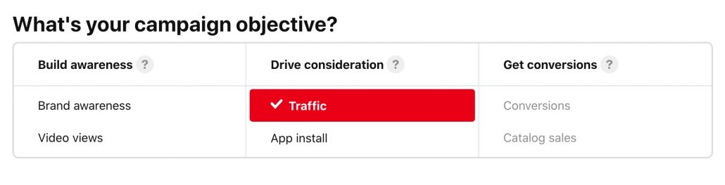 If you have the Pinterest tag installed, and it’s received enough data to be able to optimize for conversions, this is your best option. Otherwise, if you’re just starting out with Pinterest ads, you can optimize for traffic.